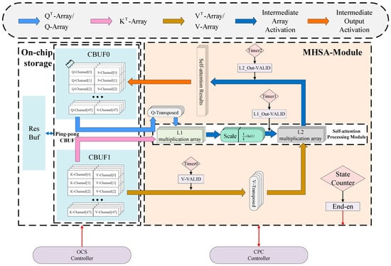 This core uses dedicated submodules to process the convolution (CONV) part, multi-head self-attention (MHSA) part, and fully connected (FC) part in Figure 3. In addition, the core applies an instruction controller to reasonably allocate the computing resources of the relevant submodules. Each submodule is configured with a state counter to monitor the progress of modular processing, which will feedback the end mark to the global controller after the module processing is completed.