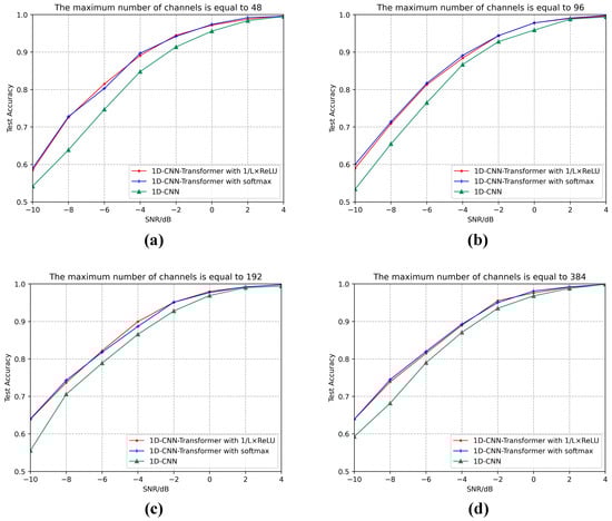 Experimental results show that the network using the 1/L×ReLU function and the network using the softmax function have almost the same model expression ability. In fact, the 1/L×ReLU function can be implemented in hardware circuits only using shift operations and data selectors. However, implementing the softmax function involves natural constant exponential operations, summation operations, and division operations, which makes it very difficult to implement on FPGA hardware. Ref. [55] used Maclaurin expansion to approximate the natural constants, and Ref. [56] proposed a new algorithm to approximate the softmax function and implement it on an FPGA. In general, they all need to use the softmax replacement algorithm and design dedicated circuits to implement the softmax function. Additionally, these algorithms still bring deviations. Therefore, compared with the softmax function, the model using the 1/L×ReLU function has the advantage of hardware-friendly implementation. To explore the impact of the maximum number of convolutional layers of the 1D-CNN-Transformer on the model recognition performance, we conducted a comparative experiment.