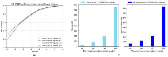 As shown in Figure 17a, the experimental results show that when the maximum number of channels of the convolution layer reaches 192 or 384, the network model can achieve a relatively good recognition performance regardless of the signal quality. As can be seen from Figure 17b, the complexity of the model with a maximum number of channels of 384 is much higher than the complexity of the model with a maximum number of channels of 192. Therefore, we adopt the network model with a maximum number of channels of 192 in the convolution layer.