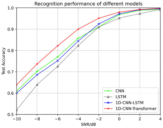 From the above experiments, we obtained a neural network model that combines low complexity and high recognition performance. In order to further compare the recognition performance of our model, we refer to the neural network models proposed in [57,58,59] for radar emitter recognition and adapt their models appropriately to fit our data. For instance, we adapt the CNN model in [57] to one-dimensional form to fit our radar emitter signal data. Then, we train these models using the same data set as our model. The experimental results are shown in Figure 18, where the green line graph is the recognition result of the CNN model proposed in [57], the gray line graph is the recognition result of the LSTM model proposed in [58], and the blue line graph is the recognition result of the CNN-LSTM model proposed in [59]. Finally, the red line graph is the recognition result of our model.
