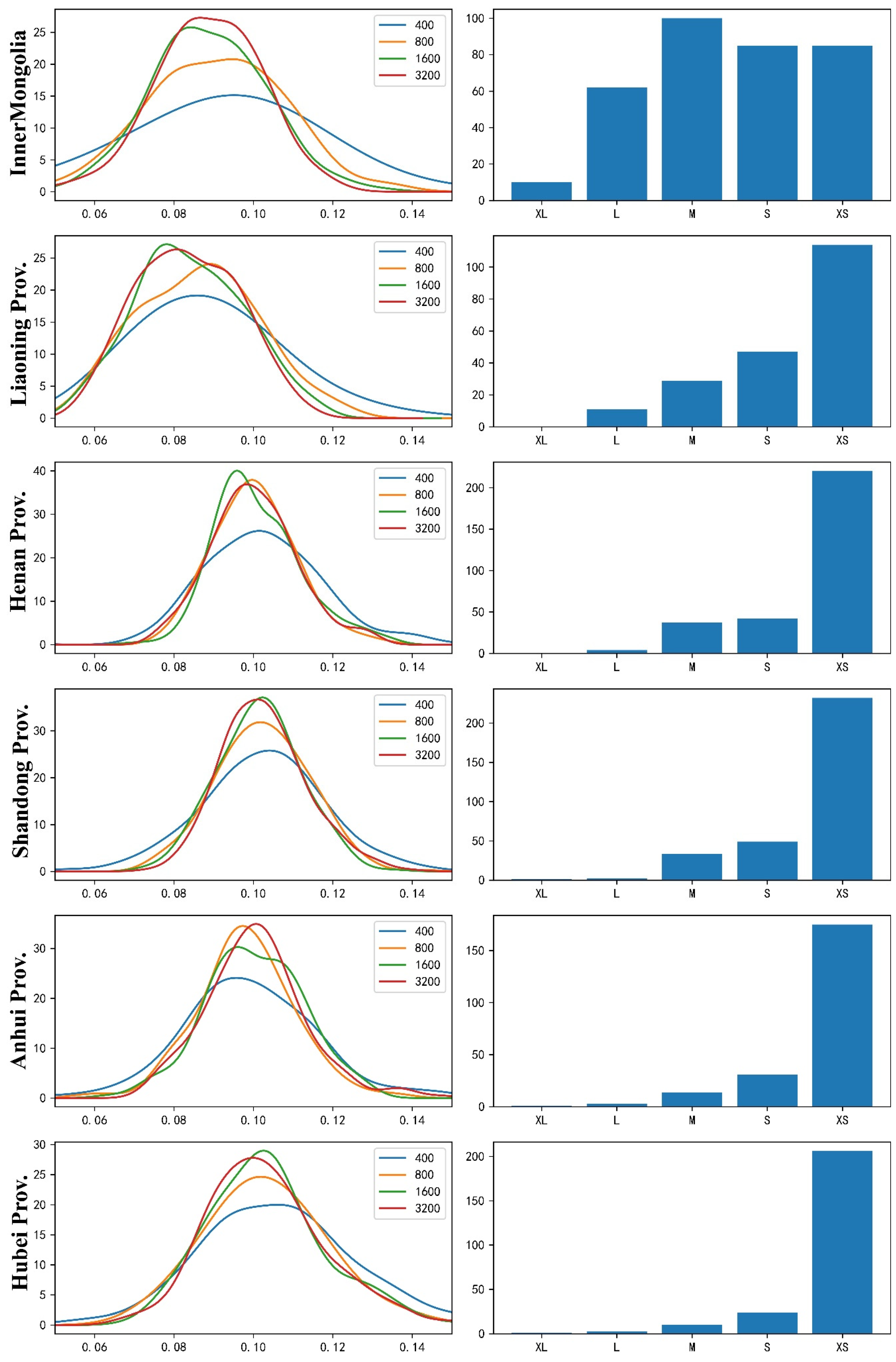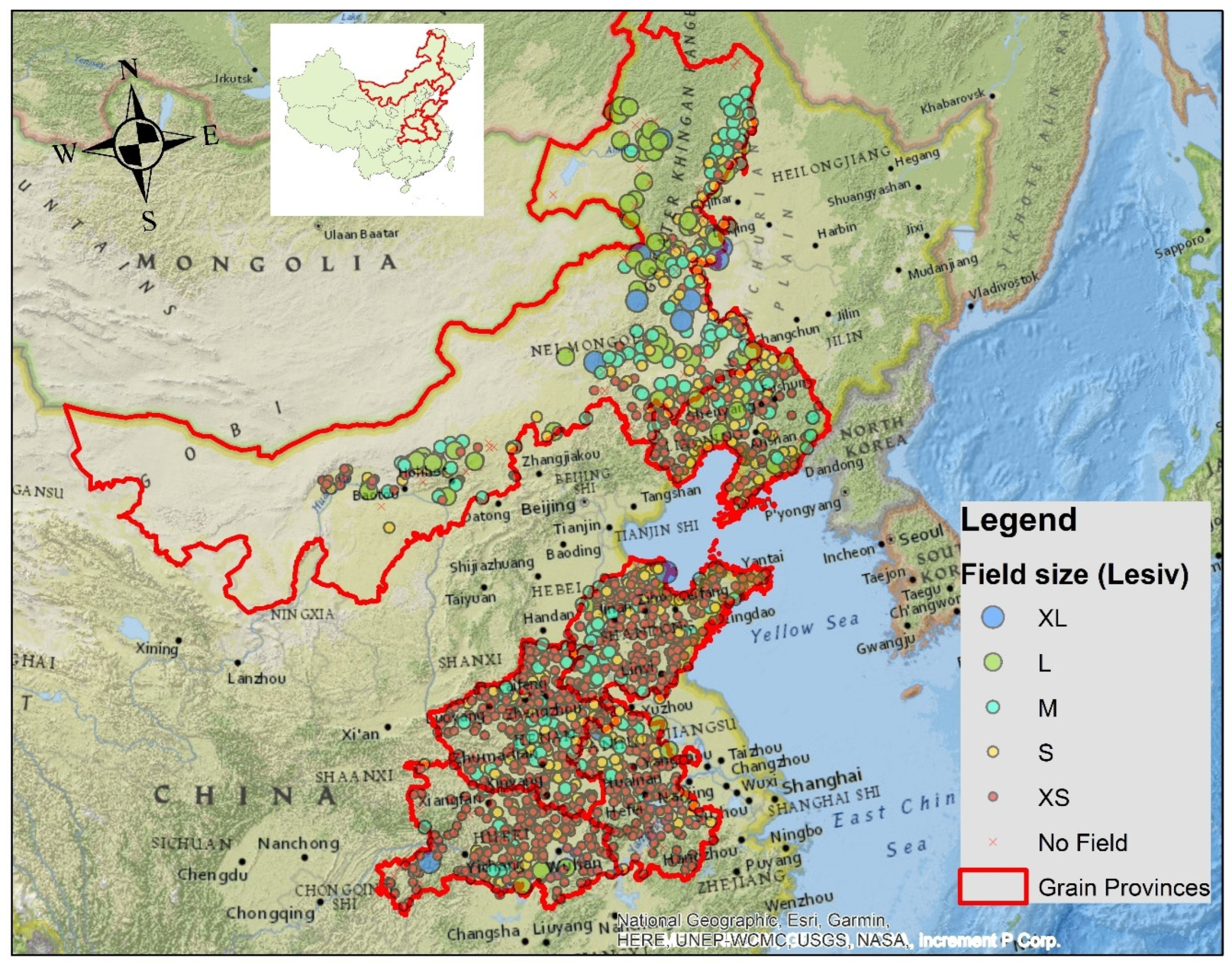 We overlaid the farmland size dataset onto the study area, using color and point size to display different levels of farmland. According to Lesiv’s estimates, large-scale farmland (L, XL) is mainly located in the Northeast China Plain, while the North China Plain is dominated by very small farmland (XS).