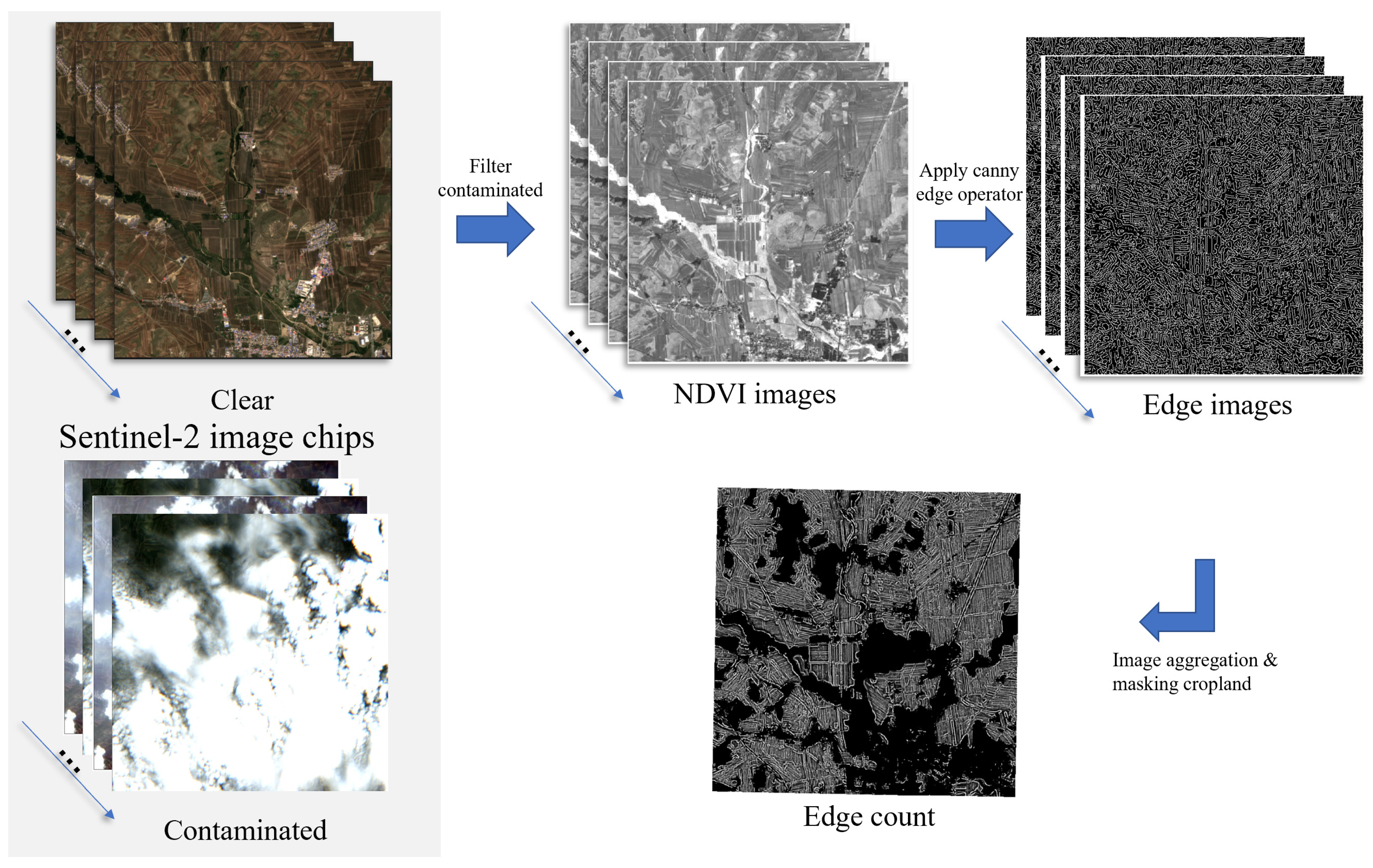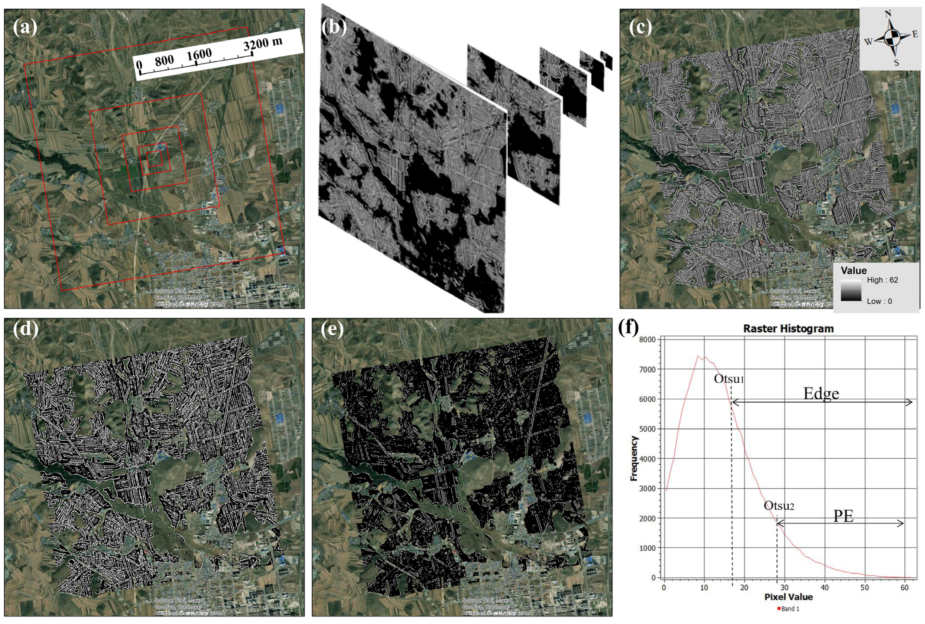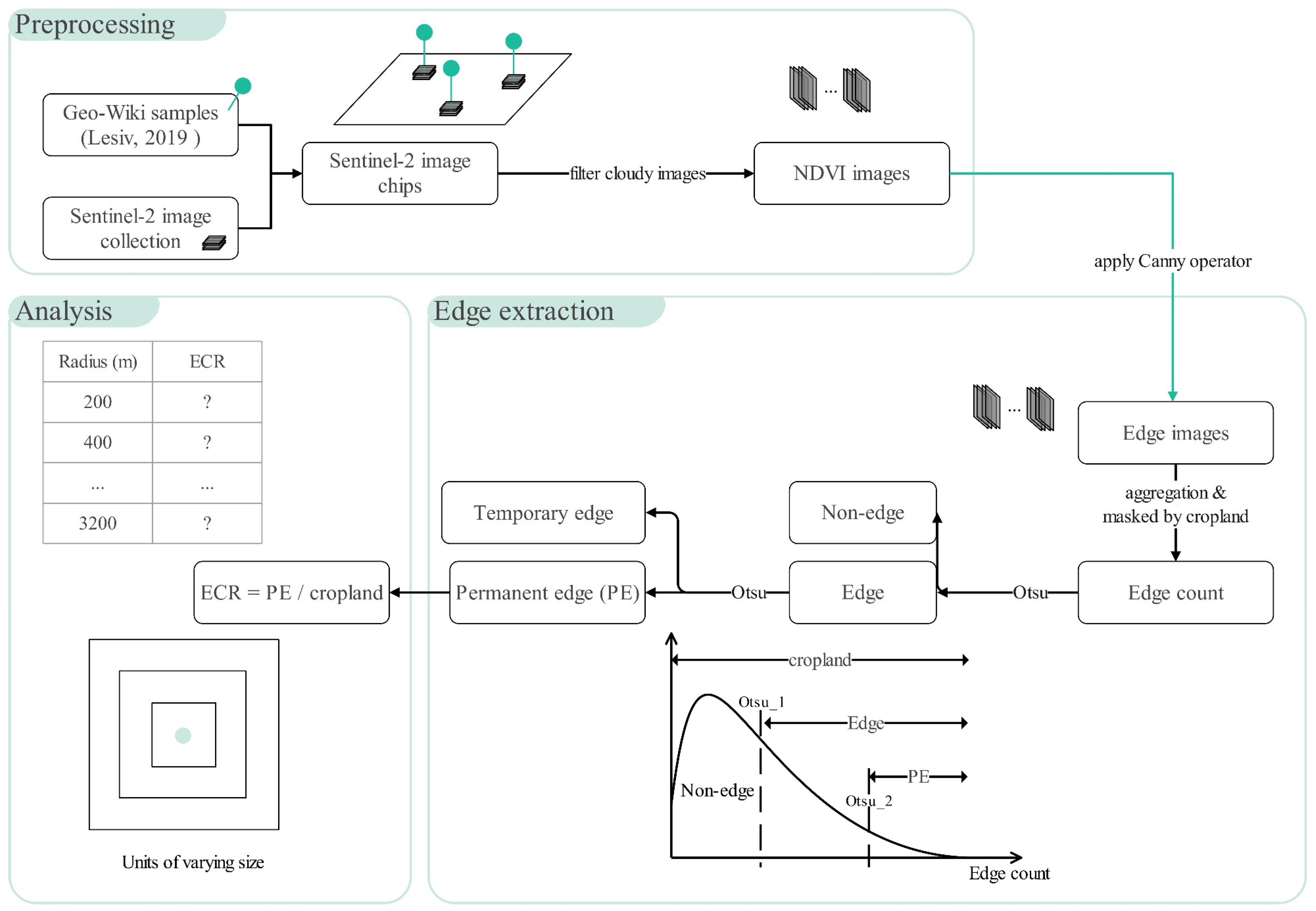 Figure 2, can be divided into three parts: (1) In the preprocessing stage, image tiles of the sample area are acquired, and vegetation indices are calculated. (2) In the edge extraction stage, edge detection algorithms are applied to identify edges from the vegetation indices. The frequency of edge occurrences is calculated, and the Otsu automatic thresholding algorithm [