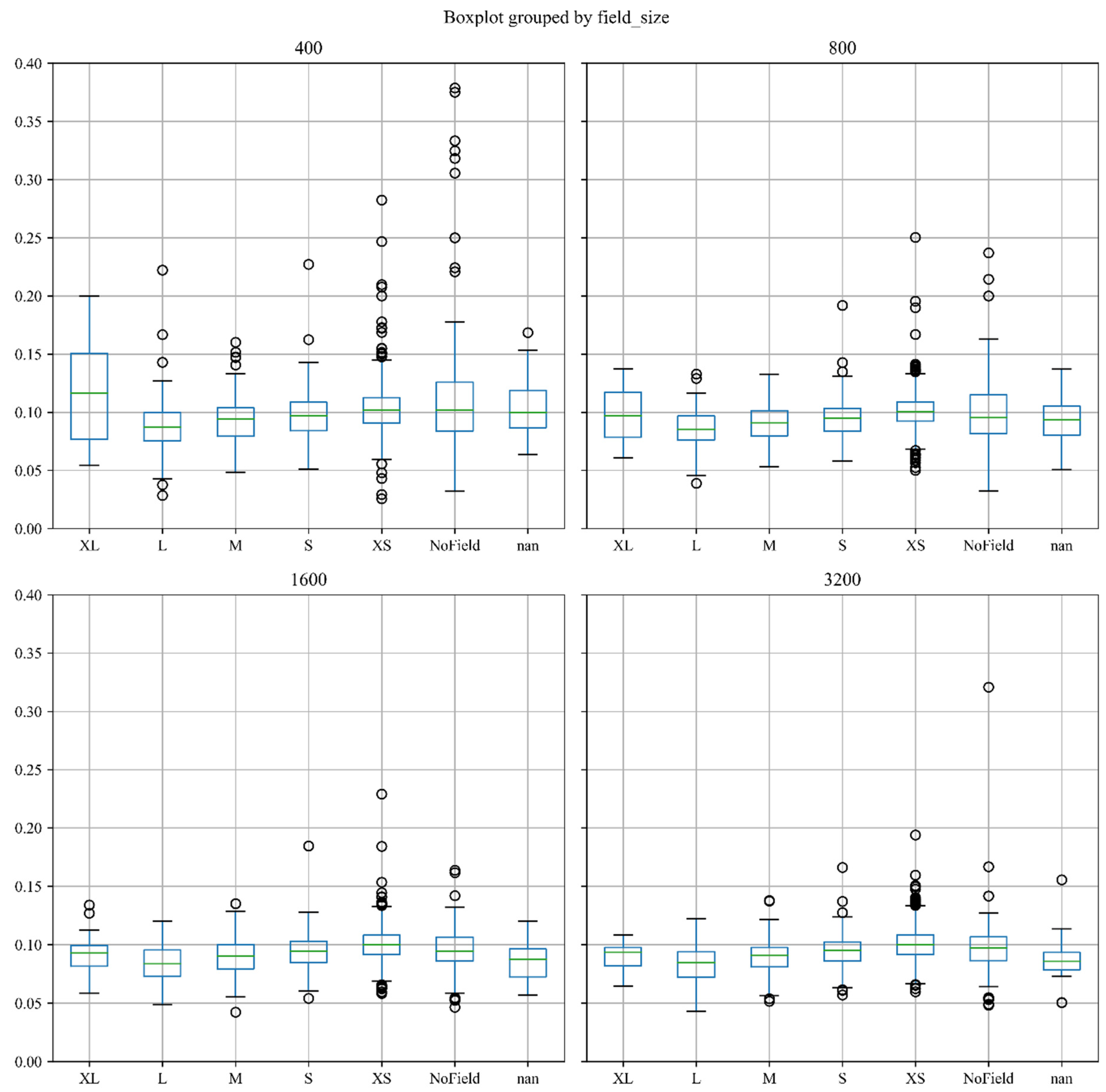 The ECR indicator is affected not only by the actual farmland size but also by the estimation radius of the sample points. Therefore, we conducted a robustness test on the radius of the ECR to determine the optimal radius. To preserve heterogeneity, a smaller radius is needed. However, the smaller the radius, the less farmland area is included in the sample, and when it is small enough, the statistical distribution of the edge counts will not be typical, and the Otsu threshold segmentation algorithm based on a histogram distribution will not be able to find a suitable threshold, resulting in more outliers in the ECR estimation. The radius used for the interpretation of the Geo-Wiki dataset is 200 m, so we started testing from 200 m, then testing 200 m, 400 m, 800 m, 1600 m, and 3200 m.