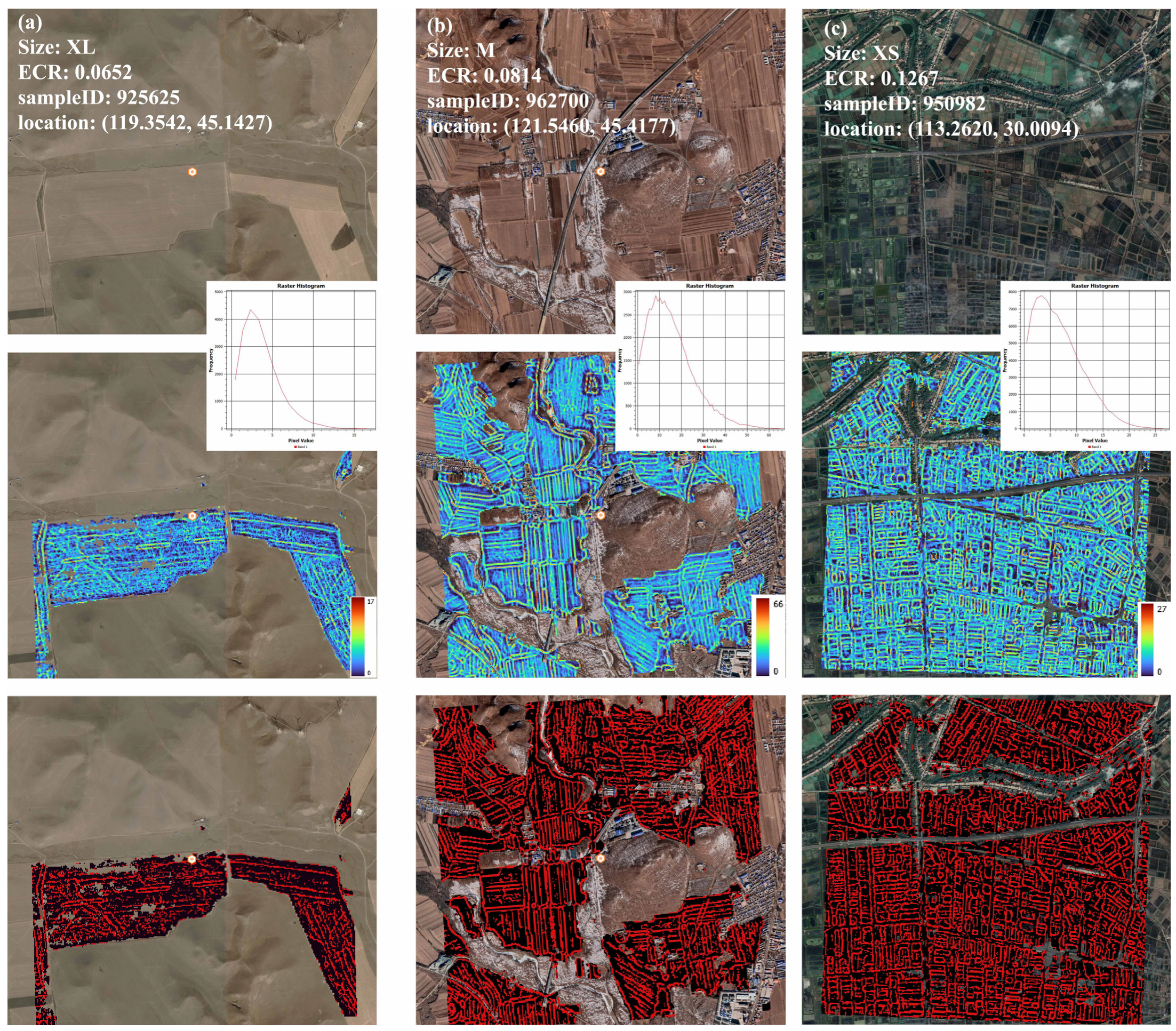 6]. We compared our ECR estimation results with it to validate our algorithm. There were a total of 1792 sample points in the study area for this dataset. Based on the farmland size within a 200 m radius grid around the sample point, three volunteers interpret high-resolution remote sensing images to determine the dominant farmland size, divided into five levels: XL for >100 ha, L for 16–100 ha, M for 2.56–16 ha, S for 0.64–2.56 ha, and XS for <0.64 ha. In addition, there is “No field”, indicating no farmland within the range, and “NA” for no label due to inconsistent labeling by the three volunteers or a lack of available satellite imagery for interpretation. It is worth noting that labeling based on the dominant farmland size, rather than the average farmland size, overestimates farmland size in areas with mixed large and small farmlands.