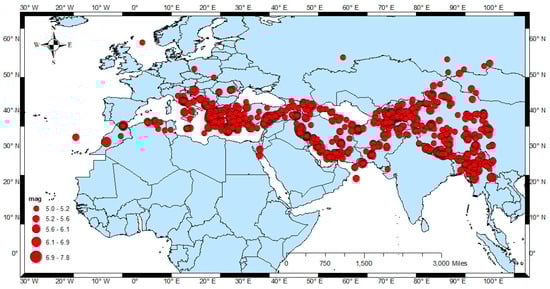 Earthquakes used in this study. Epicenters of earthquakes with a magnitude (“mag” in the legend inside the figure) greater than or equal to 5.0 that occurred in the Alpine–Himalayan belt (20° ≤ lat ≤ 60° and −20° ≤ long ≤ 100°) from 2014 to 2023 (source: https://www.usgs.gov; accessed on 1 February 2024).