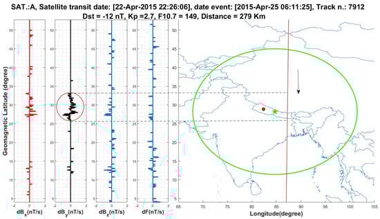 Identified magnetic anomalies. Anomalous event detected on 22 April 2015 by SW-A, which was three days before the 25 April 2015, Mw = 7.8 Nepal earthquake. The anomalous satellite-detected event occurred at a distance of 279 km from the epicenter. The epicenter is indicated by a green star, and a green oval surrounding it (the oval shape is because of the projection; it would be actually a circle over the earth’s surface and at satellite altitude), representing the Dobrovolsky area. The red line illustrates the path of the satellite. At the top of the figure, relevant information is provided, including the satellite name (Alpha = A, Charlie = C), the date and time of the satellite passing through the specified area, the date and time of the earthquake, the satellite track number, geomagnetic indices (Dst, Kp, F10.7), and the closest distance of the orbit from the epicenter of the earthquake. The direction of satellite movement is indicated by a black arrow, with the upward direction represented by an arrow pointing upwards (ascending) and the downward direction represented by an arrow pointing downwards (descending). In this case, the orbit is descending. The red point depicts another M5+ earthquake occurring in the same spatio-temporal interval.