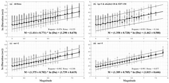Magnitude-duration correlation. The plot illustrates the relationship between the natural logarithm of anomalies duration (y-axis) and the magnitude of earthquakes (x-axis) under different conditions. (a) All the data have been considered without applying any specific conditions. (b) The data are filtered based on quiet geomagnetic conditions, with criteria such as Kp ≤ 3, |Dst| ≤ 20 nT, and F10.7 ≤ 150. (c) The data are filtered based on a signal-to-noise ratio greater than 2. (d) The data are filtered based on a signal-to-noise ratio greater than 5.