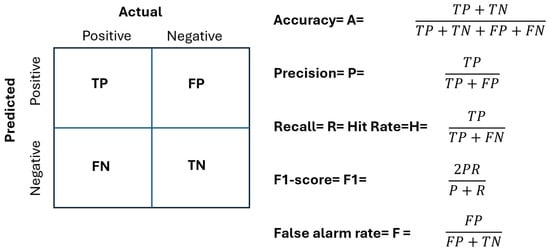 Confusion matrix (at left) and common calculated performance metrics (at right) (e.g., [53]). TP = true positives; FP = false positives; FN = false negatives; TN = true negatives.