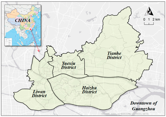 This study selected the downtown area of Guangzhou, China, the host city of the renowned Guangzhou International Marathon, as the study area; it includes the Tianhe, Yuexiu, Liwan, and Haizhu districts (Figure 1). The study area features flat terrain surrounded by water systems and has a comfortable subtropical climate, providing favorable conditions for outdoor activities [30].