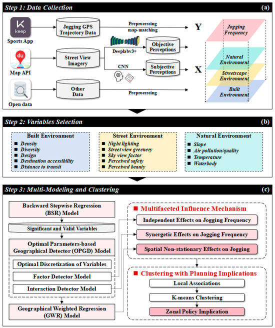 This study presents an analytical framework utilizing multi-source geospatial big data and various models to explore the relationship between environmental factors and outdoor jogging frequency in Guangzhou. Jogging trajectory data were collected from a fitness app, and key influencing factors, including the built environment, street perception, and natural elements, were identified. The framework employs three models: the BSR model for selecting significant variables, the OPGD model for identifying synergistic effects, and the GWR model for assessing spatial heterogeneity. Clustering analysis was conducted to derive urban planning strategies with practical spatial implications, offering a detailed examination of how environmental factors influence jogging behavior. The results indicated the following: (1) Factors related to the built environment and street perception significantly influence jogging frequency distribution, while natural environmental elements had minimal impact in this study. (2) Public sports facilities, greenery levels, and safety perception were identified as key factors influencing jogging activities, representing the three areas of service facilities, objective perceptions, and subjective perceptions, respectively. (3) Specifically, the influence of each factor on jogging activities displayed significant spatial variation. For instance, sports facilities and greenery levels were positively correlated with jogging frequency in the city center where jogging activities were concentrated, whereas the opposite was observed in other areas. (4) Lastly, the study area was divided into four clusters, each representing different local associative characteristics between variables and jogging activities. The planning strategies and recommendations based on the clustering results have significant implications for urban planners’ and policymakers’ ability to foster and enhance the street exercise atmosphere and create jogging-friendly environments.