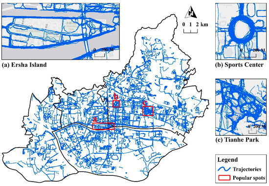 The jogging GPS trajectory data were obtained from the Keep app (http://api.gotokeep.com, accessed on 31 December 2019), which record users’ voluntarily uploaded jogging records. A total of 94,578 anonymous jogging trajectories were collected in 2019, recording anonymous IDs and the latitude/longitude coordinates of the routes. Due to limitations in the acquisition method, specific time information for the trajectories could not be obtained [18,19]. However, all trajectory data for the year 2019 were acquired to compensate for these limitations and increase the sample size. Due to signal and hardware differences, the temporal resolution of the trajectory data averaged 3–7 s, with a spatial error range between 10 and 50 m. Following methods outlined in the relevant literature [31], after undertaking data deduplication and cleaning, which included excluding erroneous data, a total of 56,471 valid jogging GPS trajectory data were obtained (Figure 3). To ensure the homogeneity of the analysis units in the subsequent spatial modeling analysis and considering the coverage of trajectory data with different grid sizes [32], a grid size of 300 m was chosen as the spatial unit, counting the frequency of trajectories within each grid as the frequency indicator.