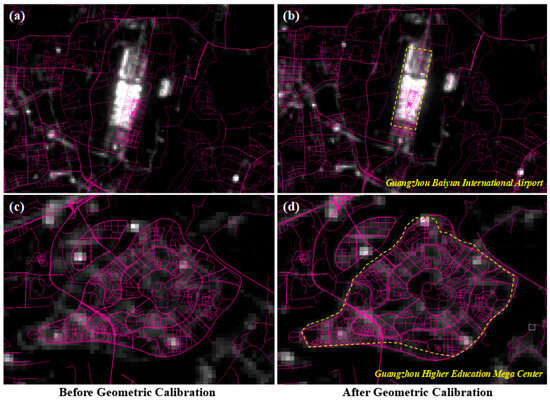 The Luojia 1-01 NTLs data before (a,c) and after geometric calibration (b,d).