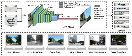 Wang et al. developed a CNN model to predict perception scores for SVI images, utilizing the Visual Geometry Group network (VGGNet) architecture [50]. This network comprises three convolutional layers and three fully connected layers interspersed with 2 × 2 max-pooling layers (Figure 7). Each convolutional layer contains a dual layer of 3 × 3 convolutional filters. Unlike the typical softmax layer used for multiclass classification, a one-dimensional fully connected layer was employed to preserve image features. Max pooling was utilized to reduce data dimensionality and facilitate the learning of high-level feature maps. To mitigate overfitting, dropout was implemented, and batch normalization was employed to normalize hidden layer outputs. For the effective training of the VGGNet, an appropriate dataset is crucial for exploring complex perceptions. The local training dataset was used to train six models corresponding to perceptual dimensions: beauty, boredom, depression, safety, vitality, and wealth. Local volunteers scored each SVI image in the training dataset, reflecting the genuine urban perceptions of the environment of Chinese cities. Compared to the human–machine adversarial framework proposed by Yao et al. [51], the CNN–VGGNet-based models effectively extracted image features and quantified urban perceptions of the SVI images [50]. The Pearson correlation coefficient between the model predictions and actual values for the testing dataset exceeded 0.9, indicating high accuracy [50]. Significantly, unlike models trained on the MIT Media Lab’s Place Pulse dataset [52,53,54,55], the model trained with the local dataset provided more accurate predictions of Chinese cities’ perception scores due to the influence of residents’ sociocultural backgrounds [51,56]. Consequently, we applied the collected SVI data to the pre-trained model to measure six perceptual metrics—beauty, boredom, depression, safety, liveliness, and wealth—encompassing both positive and negative dimensions of human perceptions. Based on the relevant studies, there is a high degree of correlation between the subjective perceptions identified through SVI data [53,54], and it has been found that safety (Safe) and liveliness (Live) play crucial roles in outdoor activities [18]. Therefore, we selected Safe and Live as independent variables.
