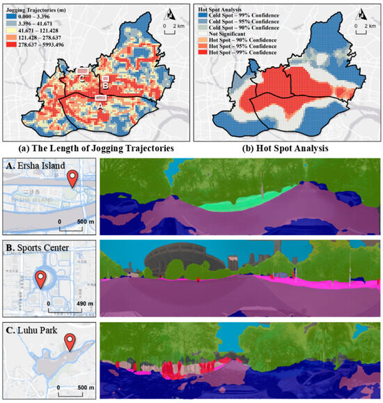 Spatial distribution of the length of jogging trajectories of each grid (a) and the hot spot analysis (b).