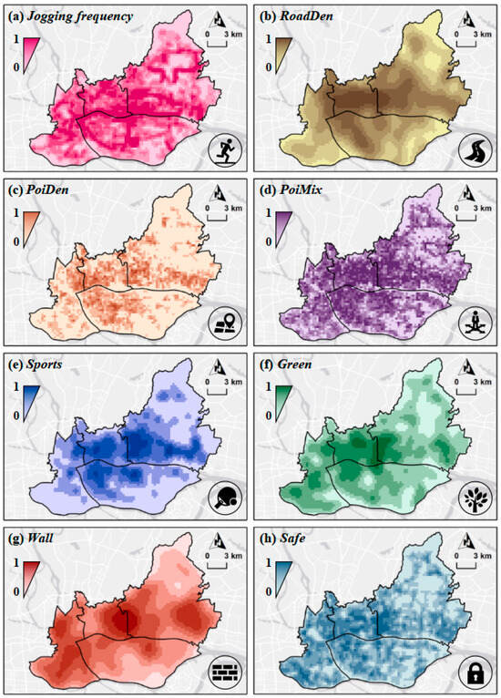 Spatial distribution of the significant variables including jogging frequency (a), RoadDen (b), PoiDen (c), PoiMix (d), Sports (e), Green (f), Wall (g), and Safe (h).