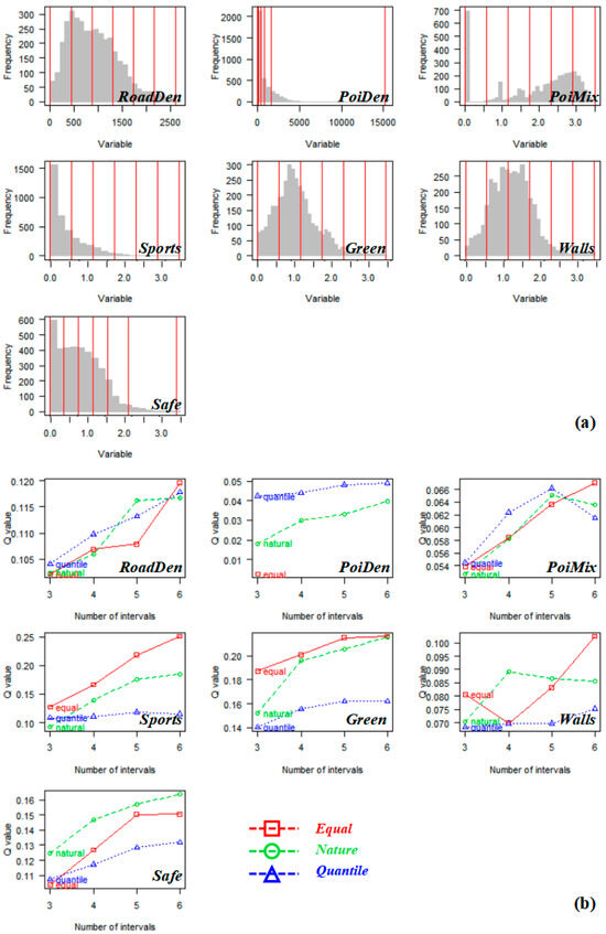 The discretization process utilized in this study is illustrated in Figure 10. For each variable, we evaluated 12 combinations, encompassing three discretization methods and four interval numbers. The combination yielding the highest q value was identified as the optimal choice. Figure 10b and Table 4 display the discretization outcomes along with the optimal combinations of discretization methods and interval numbers. It is important to note that the discretization results, including the choice of method and interval numbers, are influenced by the data distribution and the similarity to the spatial distribution of jogging activities, rather than by the absolute q value.