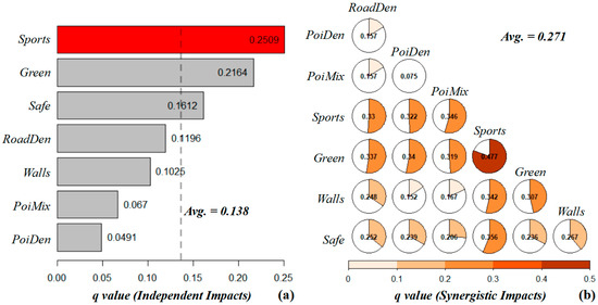 The results of the OPGD model, encompassing the factor detector sub-model and the interaction detector sub-model, are shown in Figure 11. These sub-models represent the independent effects of factors on the distribution of jogging activities (Figure 11a) and their synergistic effects (Figure 11b), respectively.