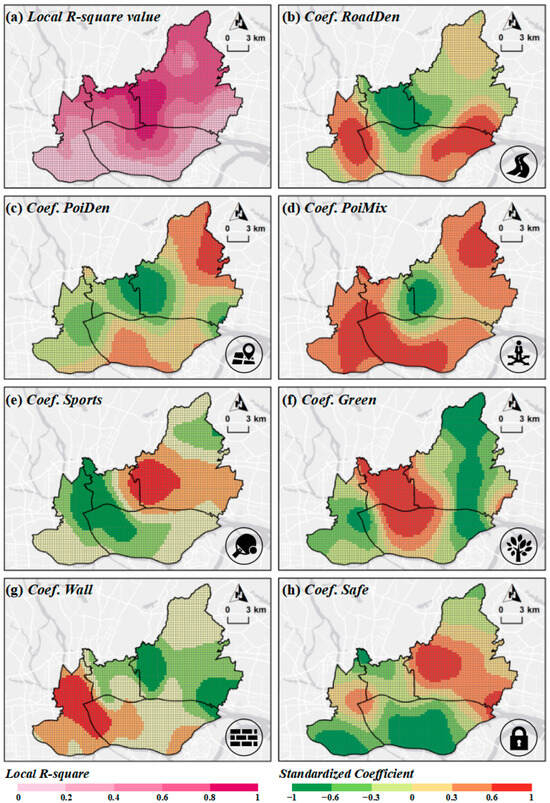 Due to the presence of multicollinearity among the variables, we initially employed the BSR model to mitigate this issue and to identify significant variables with robust explanatory power [9,57,58]. Prior to using the BSR model, the candidate variables were subjected to a zero-mean standardization, ensuring that their means were zero and their standard deviations were one. The results of the BSR model are presented in Table 3. From the 18 candidate variables, 7 significant and highly explanatory independent variables were selected. For the built environment category, the retained effective variables included RoadDen, PoiDen, PoiMix, and Sports. For the street perception category, the effective variables retained were Green, Walls, and Safe. However, the variables related to the category of the natural environment category were excluded by the model. The spatial distribution of the seven significant and highly explanatory variables is shown in Figure 9.