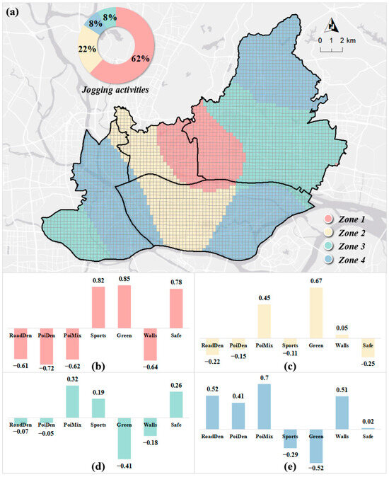 Most studies on jogging behavior mechanisms typically conclude with model interpretations and broad policy implications, often lacking specificity and practical utility, especially when the spatial context is not considered. To address this limitation, after analyzing spatial effects on jogging distribution using the GWR model, this study introduces a k-means clustering method based on local variables. This approach categorizes the study area into clusters with similar influencing factors, enabling the formulation of more targeted and effective planning and management strategies.