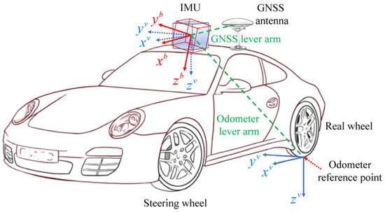 Integrating the global satellite navigation system (GNSS) and inertial navigation system (INS) can complement each other’s defects and offer more precise and stable navigation information, thus providing high-precision positioning and navigation solutions for land vehicles [1,2]. However, when vehicles travel through complex urban environments, the GNSS may experience a decrease in navigation accuracy due to satellite signal interference or interruption. Especially when vehicles are traveling between high-rise buildings, under trees, or in tunnels, the navigation state often drifts based on low-cost inertial measurement units (IMUs) [3]. Multi-source information fusion can enhance the GNSS/INS integrated navigation accuracy as the signal state is poor. The commonly used external added sensor for land vehicle navigation is the odometer, which possesses the benefits of high cost-effectiveness and easy deployment and can supply vehicle forward speed information [4,5,6]. The GNSS signal is inaccessible, so odometer-assisted inertial navigation can dramatically enhance the positioning precision. While using odometry, two parameters significantly affect the navigation accuracy. The first is the mounting angle, which is the angle between the IMU body frame (b-frame) and vehicle frame (v-frame) [7]. When installing navigation equipment, angle deviation is inevitable. Although the deviation angle is small, it can significantly impact positioning accuracy. The second is the lever arm, which is the relative position between the IMU’s center and the odometer’s reference point [8,9]. If the lever arm is unknown, when the car turns, there will be significant differences in the estimation of vehicle speed between the IMU and the odometer due to the non-overlap between the IMU and the odometer, thus making it challenging to perform high-precision data fusion. In addition, the GNSS lever arm considerably influences navigation precision. Therefore, the present research focuses on accurately estimating the IMU mounting angles, odometer lever arm, and GNSS lever arm from the data processing perspective. The schematic diagram of the mounting angle and lever arm is shown in Figure 1.