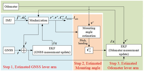 Schematic diagram of online estimation algorithm for mounting angles, GNSS lever arm, and odometer lever arm.