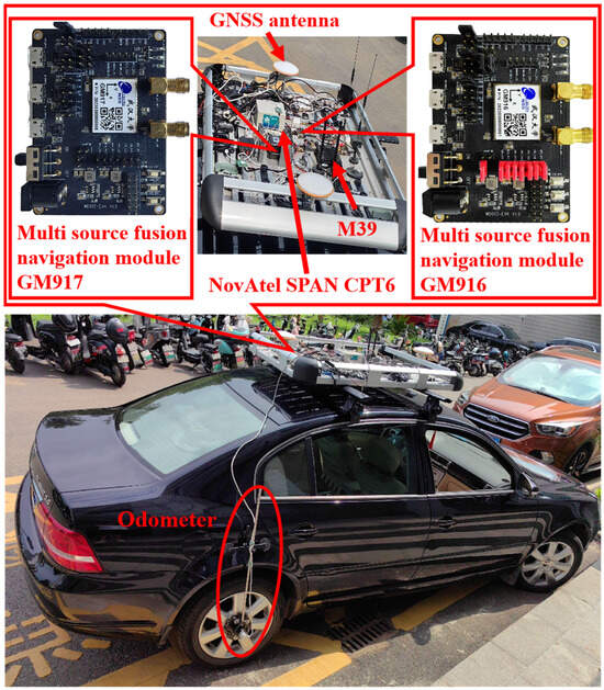 The vehicle-mounted test platform used for algorithm testing is shown in Figure 4, including tactical-level and MEMS-level multi-source fusion navigation equipment NovAtel SPAN CPT-6 (dual frequency GNSS RTK/fiber IMU), MAP Space Time M39 (consumer grade MEMS IMU), self-developed GM916 (low-cost chip-level MEMS IMU), and self-developed GM917(low-cost chip-level MEMS IMU). The Chinese characters on the GM916 and GM917 chips mean Wuhan University. Throughout the entire testing process, the output of the NovAtel SPAN CPT-6 was used as a reference truth value, and data were collected simultaneously to validate the algorithm. In addition, the raw data of M39, GM916, and GM917 were also collected for algorithm validation. We have also installed an odometer on the right rear wheel to help MEMS-INS improve positioning accuracy. Table 1 lists the performance standards for different IMUs on the four devices.