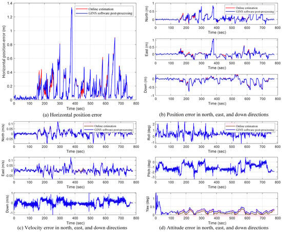 In the process of odometer-assisted inertial navigation, it is imperative to convert the speed information in the v-frame of the odometer to the b-frame, so mounting angles are required. To further verify the effect of the post-processing and online estimated mounting angles on the positioning accuracy, the GNSS was interrupted for 30 s, during which only the odometer-assisted inertial navigation was available, and the navigation positioning errors of the two mounting angle estimation methods were compared by testing. During the odometry-assisted inertial navigation, the odometry measurement update frequency was 10 Hz. The position, velocity, and attitude errors of the two methods are shown in Figure 5, from which it can be observed that the mounting angles estimated by the post-processing of the GINS software (version 1.0) have almost the same effect on the integrated navigation accuracy as the mounting angles assessed online. This also reflects the effectiveness and feasibility of the online estimation of the mounting angles strategy presented in this study.