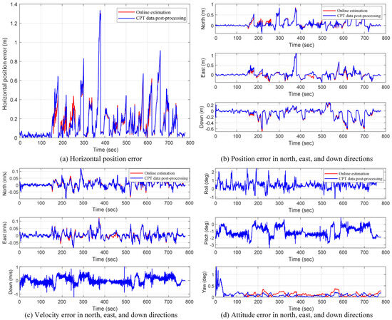 In addition, the impact of the mounting angle errors calculated by online estimation methods and CPT data post-processing methods on navigation positioning accuracy was also compared, as shown in Figure 6. This comparison method also interrupts GNSS for 30 s, during which only the odometer assists in inertial navigation. The figure shows that the mounting angle error calculated by the two methods has almost the same impact on positioning accuracy.