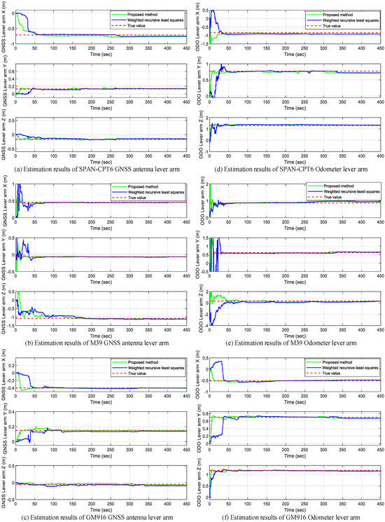 To confirm the correctness of the lever arm estimation algorithm, we collected the data from SPAN CPT6, M39, and GM916, which were used to estimate their respective lever arm values. Meanwhile, the weighted recursive least squares method is used to evaluate the lever arm and contrast with the method presented in this study.