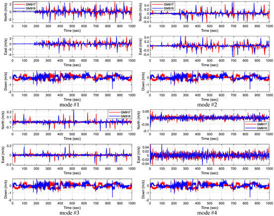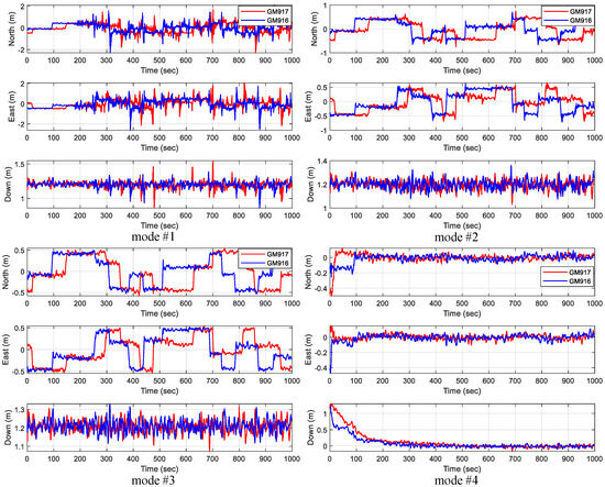 According to the definitions of the mounting angles and lever arm, after compensating for the mounting angles and lever arm, if the errors fluctuate around zero in the integrated navigation results, it indirectly indicates that the mounting angle and lever arm estimation is accurate. Taking the compensation of GM917 and GM916 as an example, the errors under the four compensation modes were compared to demonstrate the effectiveness of this paper’s estimation algorithms. The different compensation modes are listed in Table 5.