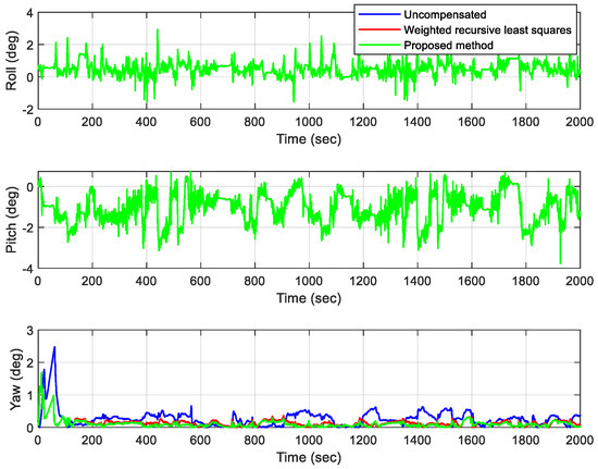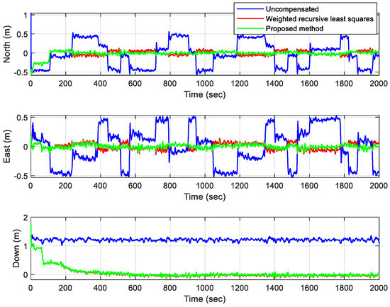 Finally, after compensating the mounting angle, odometer, and GNSS lever arm, the proposed method is compared with the weighted recursive least squares strategy for position, velocity, and attitude errors. As shown in Figure 10, Figure 11 and Figure 12, the proposed method has slightly better position errors in the north and east directions compared with weighted recursive least squares. After the convergence of the proposed method, the maximal position errors in three directions are 0.1 m, 0.08 m, and 0.05 m, and the maximal velocity errors are 0.03 m/s, 0.032 m/s, and 1.58 m/s. The maximal pitch, roll, and heading errors are 2.9 degrees, 3.7 degrees, and 0.38 degrees. However, the longitudinal velocity error is large and is mainly affected by the vehicle damping system and acceleration/deceleration. At the same time, the error of pitch and roll is also large, mainly because the mounting angle and lever arm have little influence on it, resulting in no obvious improvement effect. In addition, it can be seen from Figure 10, Figure 11 and Figure 12 that without compensation, the maximal position errors in three directions are 0.55 m, 0.52 m, and 1.32 m, and the maximal velocity errors are 0.16 m/s, 0.18 m/s, and 0.92 m/s. The maximal roll, pitch, and heading errors are 3.02 degrees, 3.75 degrees, and 2.46 degrees. By comparison, it can be concluded that the error is significantly reduced after compensation utilizing the method presented in this article.