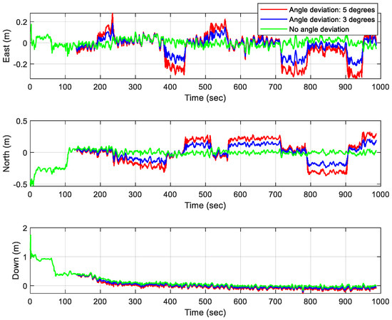 It can be seen from the figures that correctly compensating for the mounting angles, the maximal position errors in the north, east, and down directions are 0.09 m, 0.08 m, and 0.05 m, and the maximal velocity errors are 0.03 m/s, 0.032 m/s, and 0.87 m/s, as shown by the green line in the figure. Deviating from the correct direction by 3 degrees, the maximal position errors in three directions are 0.18 m, 0.23 m, and 0.39 m, and the maximal velocity errors are 0.12 m/s, 0.13 m/s, and 0.9 m/s, as shown by the blue line in the figure. Five degrees off the correct direction, the maximal position errors in three directions are 0.34 m, 0.31 m, and 0.44 m, and the maximal velocity errors are 0.2 m/s, 0.21 m/s, and 0.91 m/s, as shown by the red line in the figure. Therefore, it could be observed in the figure that different mounting angles of the same IMU greatly influence position and velocity errors, reflecting the effect of the method presented in this study.