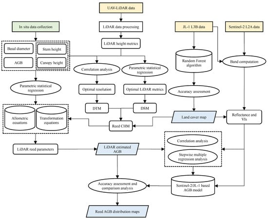 This study aims to investigate the feasibility of integrating UAV-LiDAR data and spaceborne multispectral remote sensing data for AGB estimation of the reeds, an indigenous coastal wetland vegetation species in the Yangtze River estuary, Southeast China. By combining the strengths of UAV-LiDAR and satellite remote sensing, we proposed an innovative approach to overcome the limitations of traditional field sampling-based methods for improving the accuracy and efficiency of biomass estimation in the reed coastal wetland ecosystems.