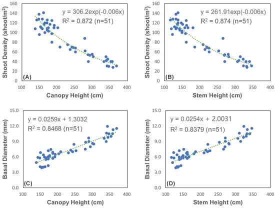 From field measurements at the 51 reed sample plots, the average canopy height and the average stem height range from 1.48 to 3.59 m and from 1.17 to 3.47 m, respectively. There is an observable variation in the density of reed plants, which spans from 28 to 141 plants per square meter for all the sample plots. The base diameter of the reed plant varies from 4.1 to 11.9 mm. Regression analysis results present the relationships between stem height, canopy height, plant density, and basal diameter (Figure 3). The R2 is calculated to evaluate the fitting degree between any two parameters of reeds. Both canopy height and stem height display a closed relationship to plant density, with a high R2 greater than 0.87 (Figure 3A,B), and so does the basal diameter (R2 > 0.83) (Figure 3C,D).