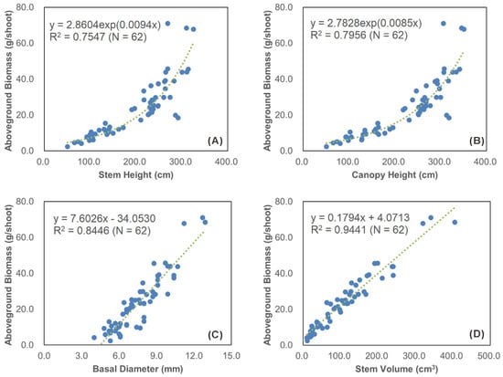 The allometric equations were constructed using the stem height (A), canopy height (B), basal diameter (C), and volume of the ideal cylinder (D) related to the reed AGB.