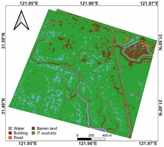 This study area contains five land covers: P. australis, barren land, water, road, and buildings. Over 90% of the area is covered with the dominant wetland vegetation P. australis, the common reed.