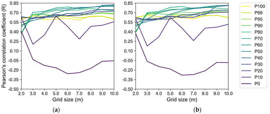 The change in Pearson’s correlation coefficients between LiDAR metrics and observed reed canopy height (a) and stem height (b) as the grid size varies from 2 to 10 m.