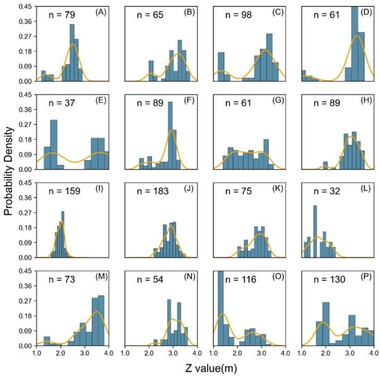 Probability density analysis was performed on the Z-values of the point cloud at 16 sample plots within the observation domain of UAV-LiDAR. Histogram fitting curves present a bimodal Gaussian distribution (Figure 7), which characterizes the height distribution of the point cloud for both the reed canopy and ground at most of the 16 plots. There are distinct occurrences in four observation plots (Plot I to L) where the point clouds are majorly concentrated in mixtures of the canopy and the ground surfaces.