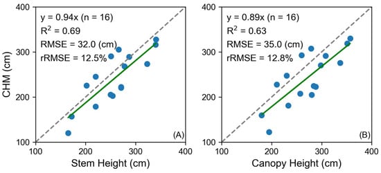 The linear regression model indicates the best accuracy (RMSE = 32.0 cm, rRMSE = 12.5%) between the difference between the 90th percentile and the minimum value of the point cloud matrix (i.e., CHM) and the observed stem height. It is observed that there is a consistent trend between the calculated CHM and the ground-truth data with a fit line slope of 0.94. In contrast, the CHM exhibits a slightly better agreement with the stem height than the canopy height (Figure 8). Therefore, the stem height is determined through a bias adjustment to estimate the reed AGB in this study area.