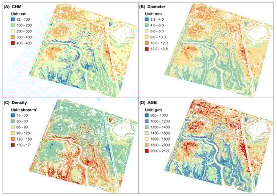 The spatial distribution of the reed CHM was obtained using the optimal 4 m resolution (Figure 9A). This was achieved by calculating the difference between the 90th quantile Z-values of the point clouds and the processed DTM. The reed stem height was then derived from the CHM through the regression equation in Figure 8A. Additionally, the spatial distribution of reed plant density and base diameter was also calculated using the AEs presented in Figure 3B,D, respectively (Figure 9B,C). Finally, the AGB of the reed beds was calculated by the AE presented in Figure 4D, and its spatial distribution was then mapped at a spatial resolution of 4 m (Figure 9D).