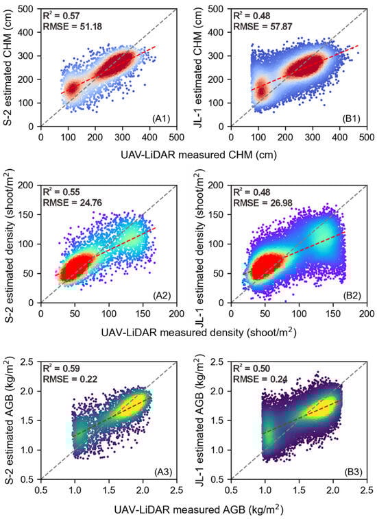 The scatterplots of predicted CHM, Density, and AGB from Sentinel-2 (A1–A3) and JL-1 (B1–B3) vs. those UAV-LiDAR-measured ones. Where, the red and yellow areas contain more dense points than other areas.
