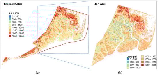 The spatial distribution of reed AGB estimated by Sentinel-2 data (a) and JL-1 data (b) by the optimal multiple regression models, respectively, where the red-line area denotes the overlapping observation areas covered by Sentinel-2 and JL-1.
