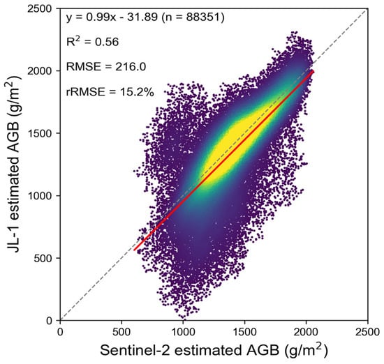 The scatterplots of the AGB estimated from Sentinel-2 vs. JL-1 data. Where, the yellow area contains more dense points than other areas.