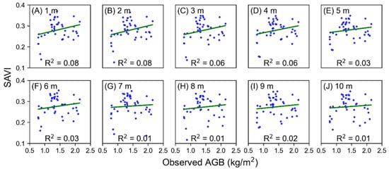 Scatter plot of the observed biomass vs. SAVI calculated from JL-1 image resampled at 1 m to 10 m resolution (A–J). Where, the green line denotes the linear regression line.