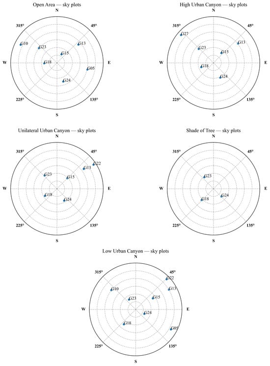 The sky plots of GNSS satellites (GPS system only) in different scenes. This figure shows the elevation and azimuth angles of navigation satellites.