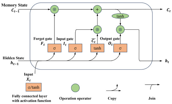 where ⊙ represents the dot product and represents the sigmoid activation function. , , are the outputs of the input gate, forget gate and output gate. , ; , ; , are the weight matrices of input, forget, output gates. , are the weight matrices of the candidate memory cell. , , , are the biases. The hidden state is caculated as follows: