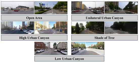 The street view of real-world locations where we collected data, including open area, high/low/unilateral urban canyon and shade of tree.