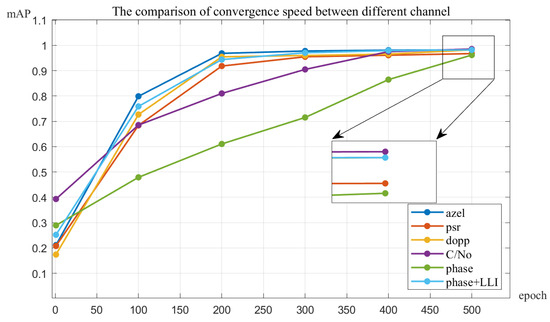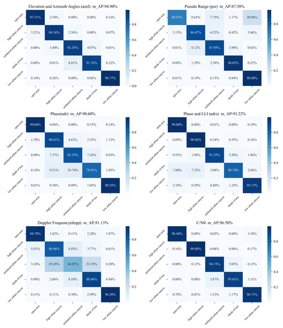 From the confusion matrices shown in Figure 6, we can find that different feature data have varying sensitivities to the recognition of different scenes. The feature of az/el and performs the best in all categories while other feature data performs in specific category (pseudo range in shade of tree, phase + LLI in high urban canyon). Meanwhile, the convergence speeds of the individual single-channel models also show significant differences, as shown in Figure 7. The az/el has the fast convergence speed while the phase has the slowest. Moreover, the performance of phase + LLI is better than single phase no matter the accuracy or the convergence speed, which prompts us to combine the carrier phase and LLI into one feature consideration in the subsequent research.