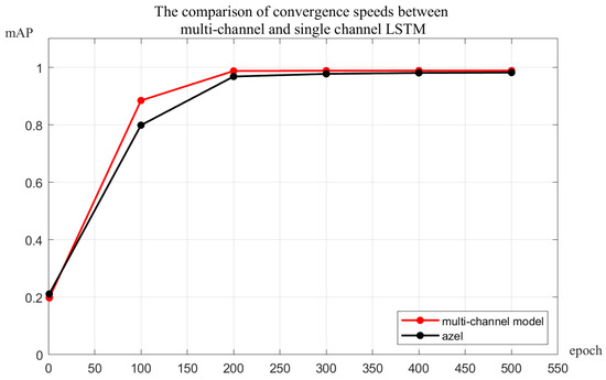 Despite the accuracy, convergence speed is also an important metric for evaluating model performance. Compared with the single channel model, be similar to accuracy, multi-channel model can also converge faster. Take azimuth and elevation angles channel (the fastest channel in convergence speed) for example, just like Figure 11 shows, the multi-channel model is faster than any other single channel in convergence speed. All results above indicate that our multi-channel design significantly enhances the performance of LSTM in recognizing GNSS positioning scenes, in terms of both accuracy and convergence speed. This demonstrates the benefits of our strategy to integrate multiple channels. It is worth noting that instead directly using existing network, our proposed model design strategy is one of the few specialized network structures specifically designed for GNSS positioning scenes in current related research.