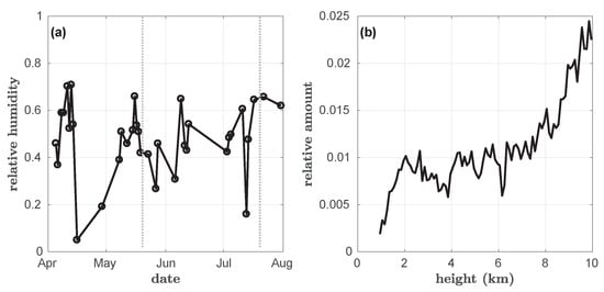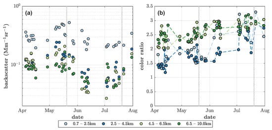 3.2. Vertical Trends in Backscatter and Color Ratio, and the Relative Humidity over Water of the Season